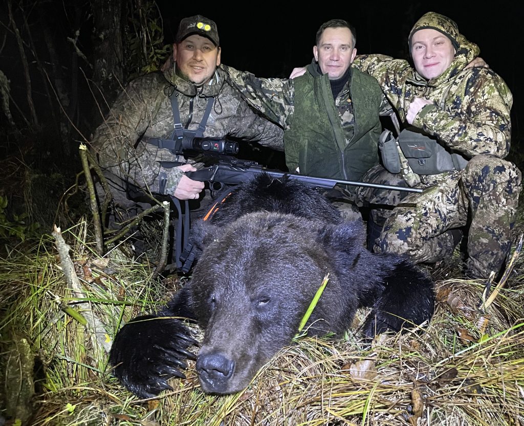Когда же егерь приехал, мы уже были мокрые до нитки (как сверху, так и снизу) от непрекращающегося дождя и мокрой травы и кустов. Но ждали мы его не зря. Спустя короткое время адреналиновых поисков, раздался лай четвероногих. И он был как бальзам на душу, как песня или еще что-то, но очень радовал слух! Подходили аккуратно, максимально соблюдая все нормы предосторожности, а убедившись, что зверь дошел, все расслабились, и я получил свою порцию поздравлений! Все получилось как надо, и даже добор добавил больше эмоций, чем негатива. При разделке нашли пулю в позвоночнике (энергии .308 калибра не хватило, чтобы его сломать), вторая пуля пробила шею на вылет. Оба выстрела были смертельными, но при всем этом медведь прошел более 100 метров. Серьезный и сильный зверь, как ни крути! Для успешной охоты на медведя требуются терпение, холодная голова, правильно подобранный патрон, надежный прицел и, конечно, наличие самого медведя!