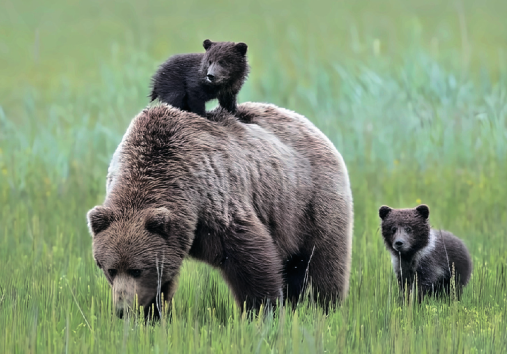 Как же он оказался прав! Стоило мне подумать, что светло же еще, как, подойдя к вышке, Олег сразу заметил медведя, кормящегося на поле. Аккуратно поднявшись (благо ветер был на нашей стороне, относя прочь лишние звуки и запахи), мы увидели, что это медведица с тремя медвежатами, которые мирно лакомились оставшимся на поле овсом. Пришлось только ждать.